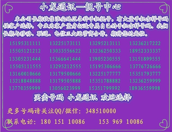 淮安市小龍通訊號碼中心-淮安手機靚號中心,為客戶提供大量手機靚號,吉祥號碼,手機吉祥號碼,為客戶提供廣泛的靚號選擇空間。信譽高,服務(wù)最好,效率最快,公司與移動,聯(lián)通,電信三大運營商合作,為客戶提供總價值過千萬的手機號碼資源,小龍手機靚號中心是淮安第一手機靚號中心。