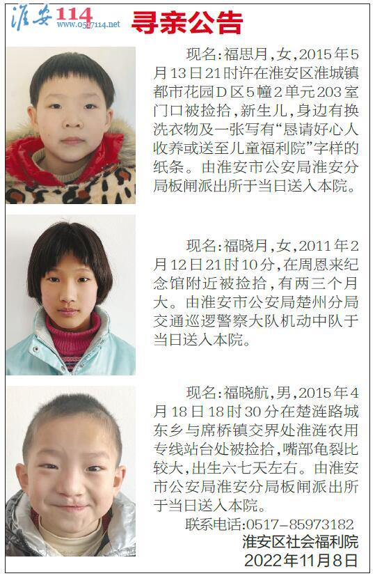 淮安區(qū)社會(huì)福利院尋親公告(11月8日)